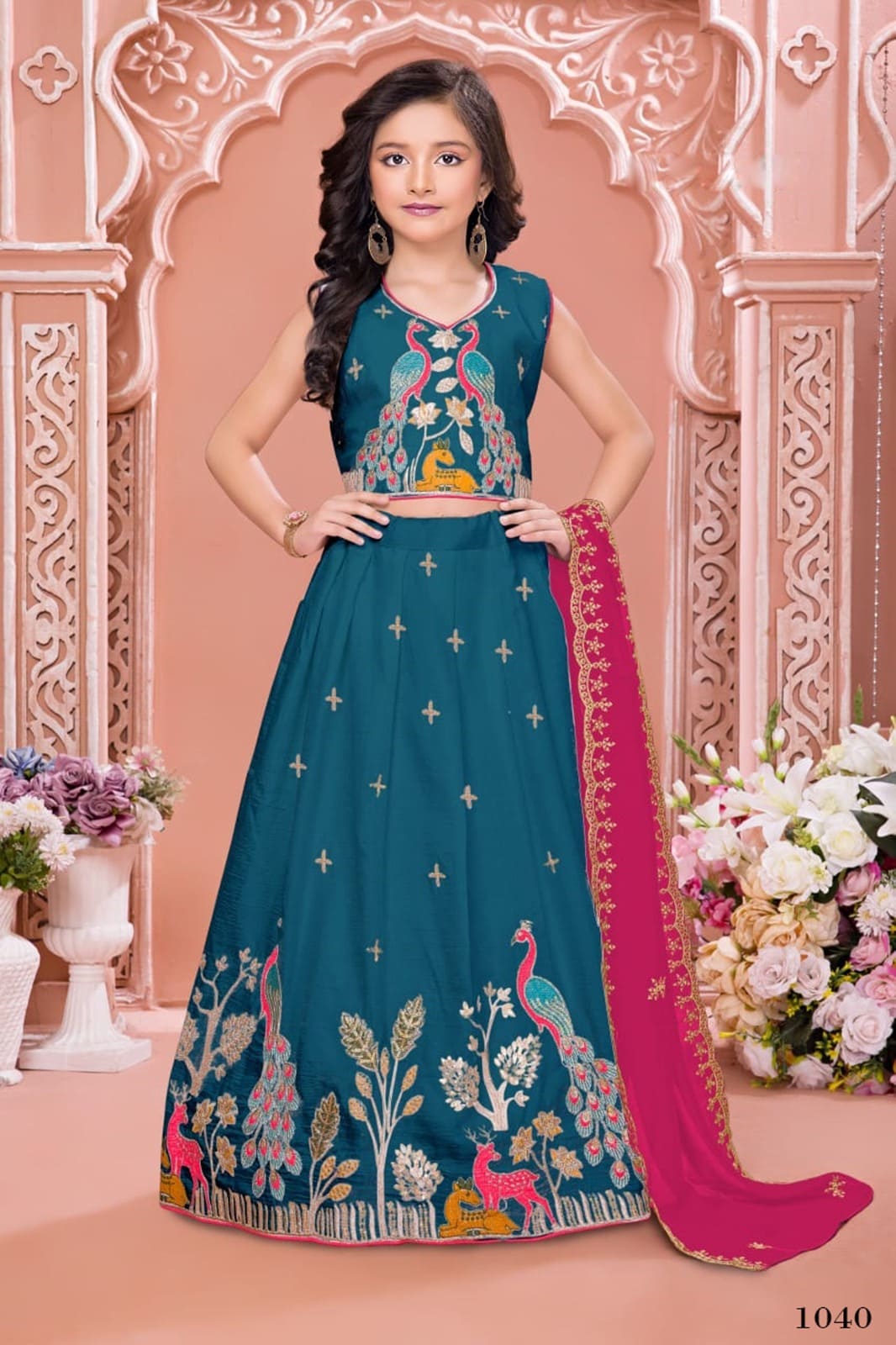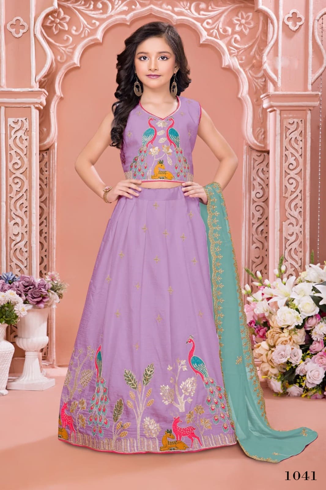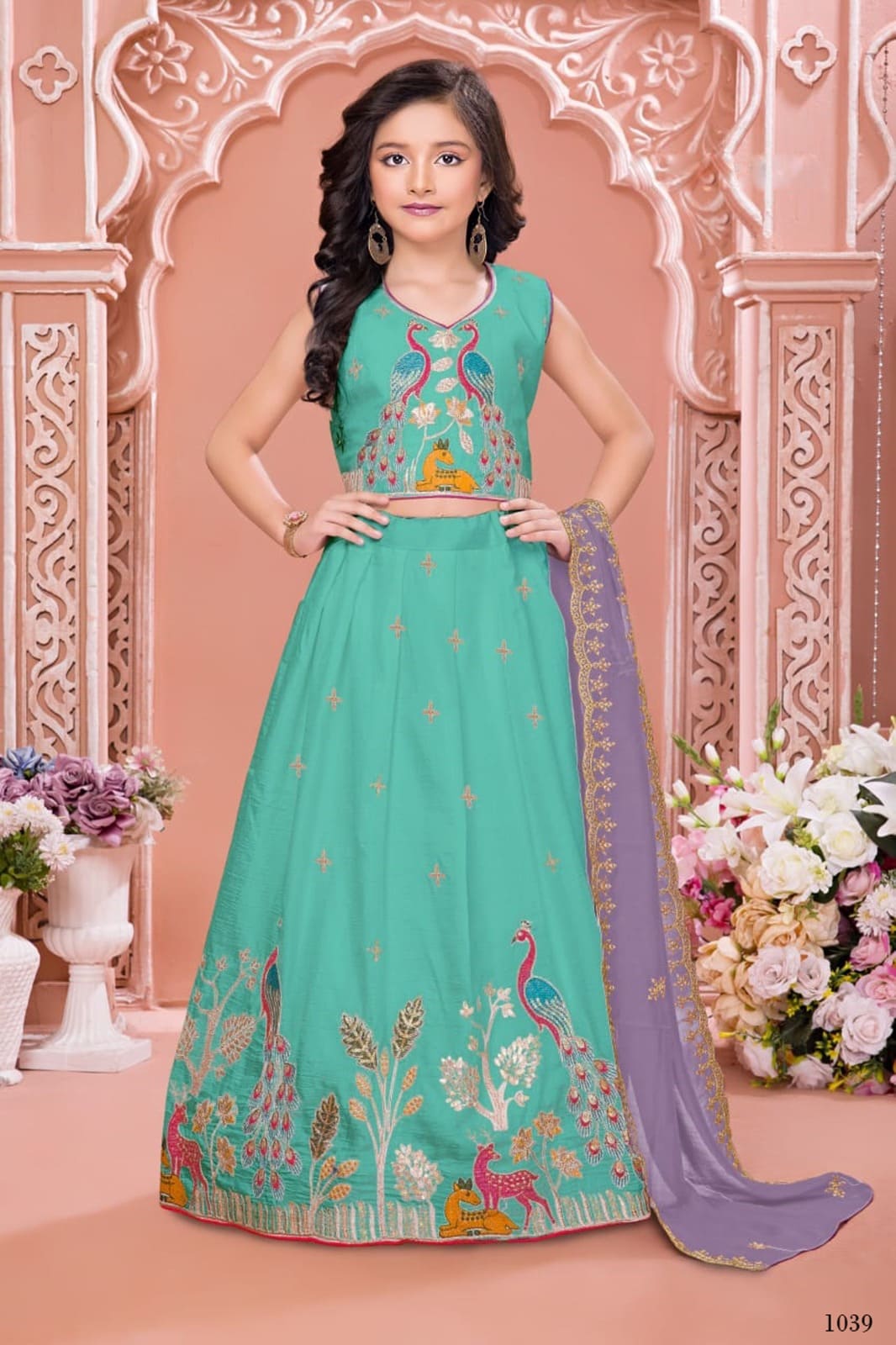 Aarvi Vol. 9 Vichitra Silk Embroidered Kids Lehenga Choli Collection features elegant designs with fine embroidery, perfect for festive and special occasions. Stylish, comfortable, and crafted from premium silk fabric.