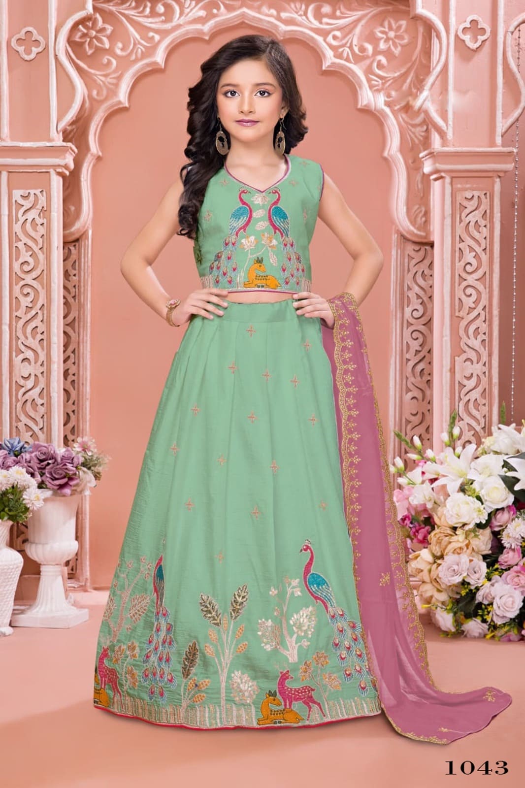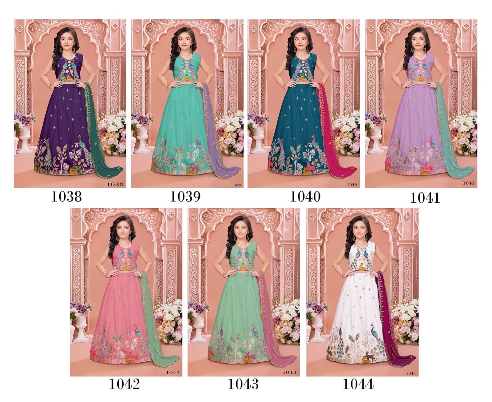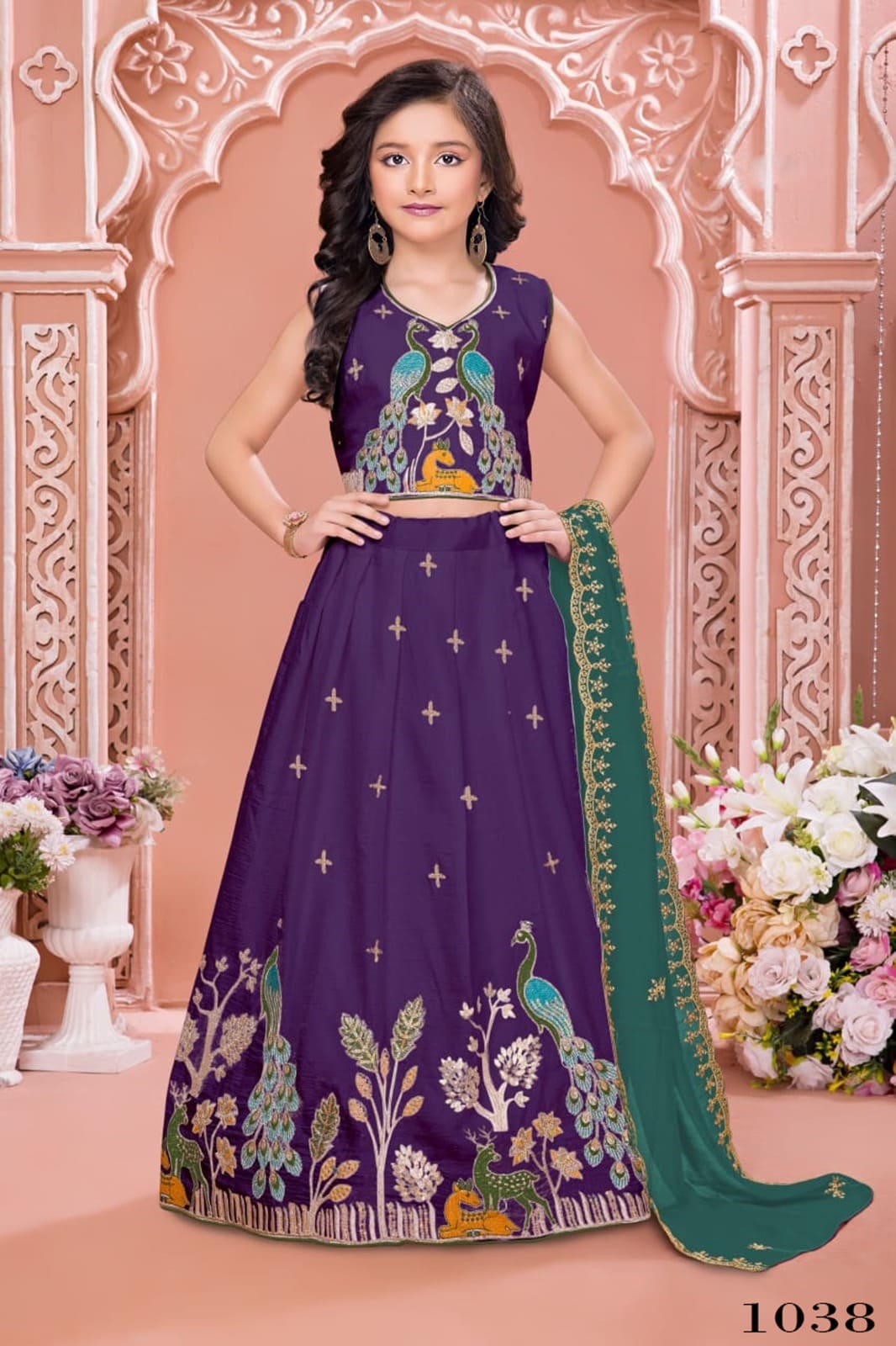 Aarvi Vol. 9 Vichitra Silk Embroidered Kids Lehenga Choli Collection features elegant designs with fine embroidery, perfect for festive and special occasions. Stylish, comfortable, and crafted from premium silk fabric.