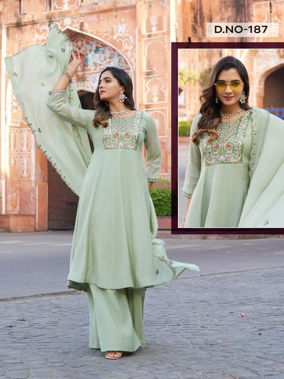 Alinee 186 and 187 Chanderi Silk Kurti Pant and Dupatta Collection features elegant silk fabric with graceful designs, perfect for festive and party wear. Experience comfort and style in every outfit.