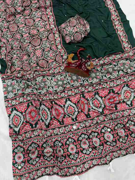 | Fabric Description | Saree fabric: Soft Cepe Silk | Work: Beautiful Ajarakh Print With Real Mirror Work And Beautiful Tassles | Blouse: Running |