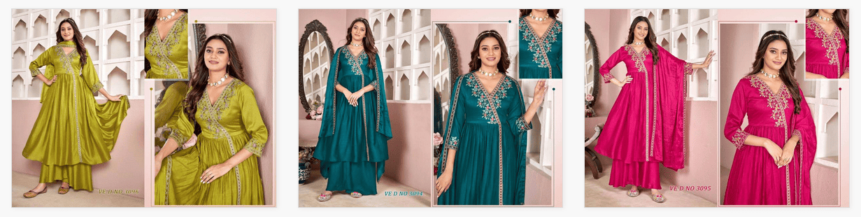 Ladies Flavour 3094 to 3096 Vichitra Silk Kurti Pant and Dupatta Collection features elegant designs crafted from premium silk fabric, perfect for festive and party wear. Elevate your ethnic style with luxurious texture and graceful detailing.