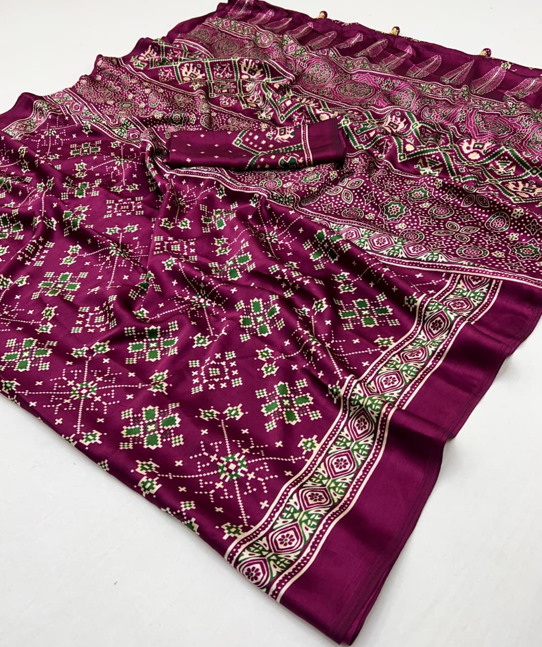 Each saree features beautiful Ajrakh-inspired patterns combined with Patola-style elements that highlight cultural heritage and artistic craftsmanship.