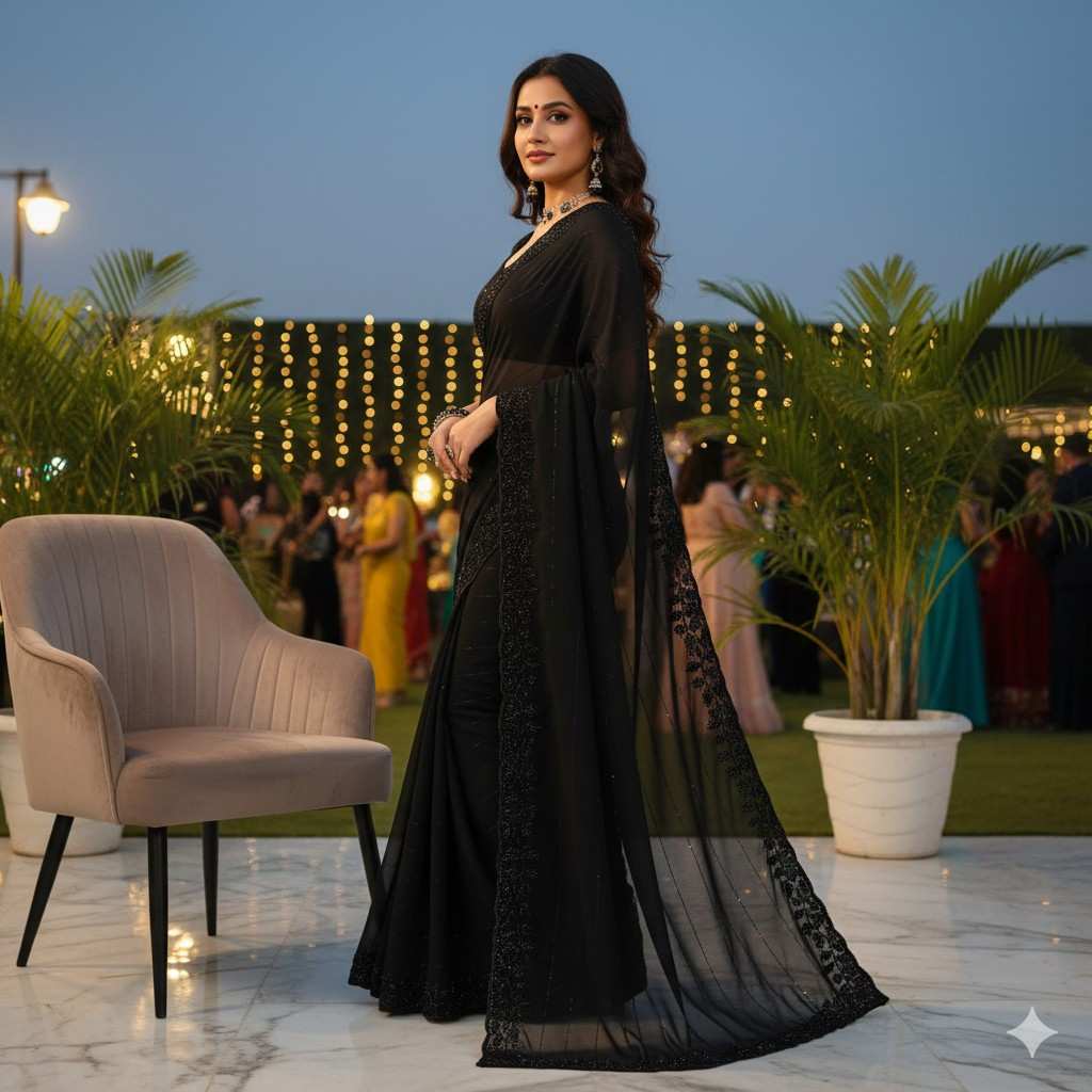Shop Black Beeds Party Wear Saree For Women by FashionExport, crafted in premium georgette with elegant hand work detailing. Perfect festive & wedding wear at best wholesale price.