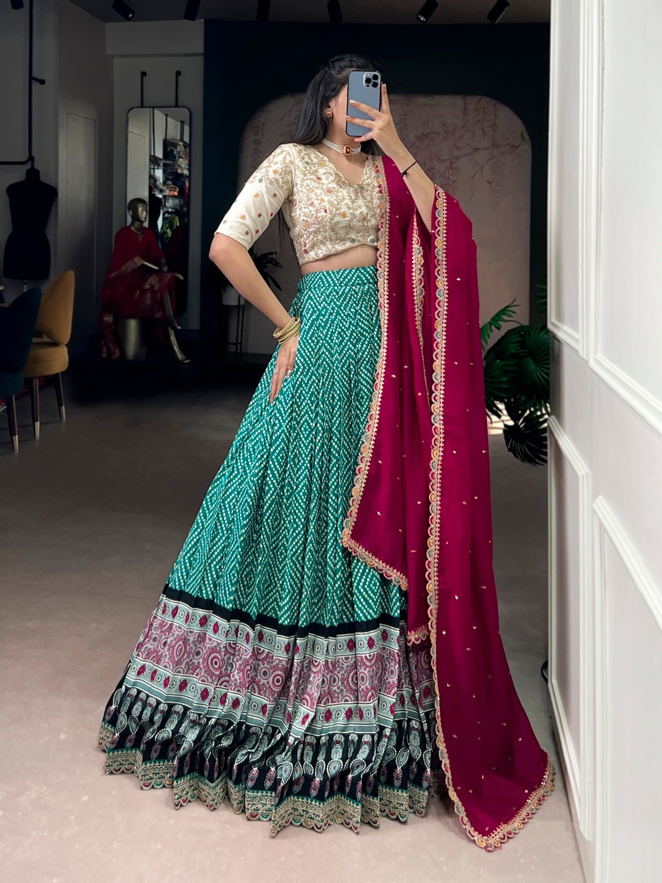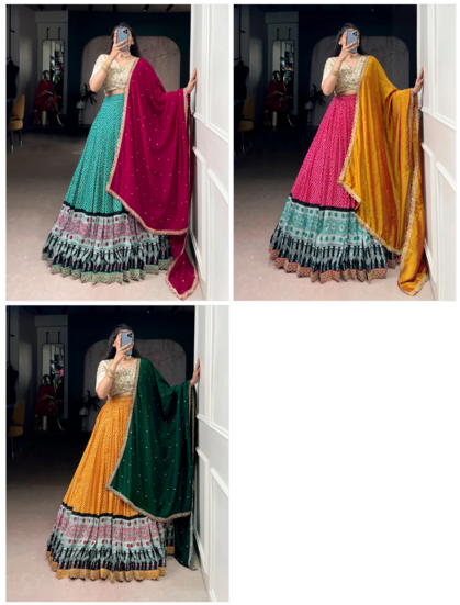 | Fabric Description | Lehenga (Stitched):- Rayon | Lehenga Work : Bandhej And Ajarakh Print With Sequins And Thread Embroidery Lace Touch Up | Lehenga Waist : Supported Up To 42 | Lehenga Closer : Drawstring With Zip | Stitching : Stitched With Canvas | Length : 41 | Flair : 4 Mtr | Inner : Micro Crepe | Blouse (Unstitched):- Vichitra Silk | Blouse Work : Sequins And Thread Embroidery Work | Blouse Length : 1 Mtr | Dupatta : Vichitra Silk | Dupatta Work : Sequins And Thread Embroidery Work | Dupatta Length : 2.4 Mtr |