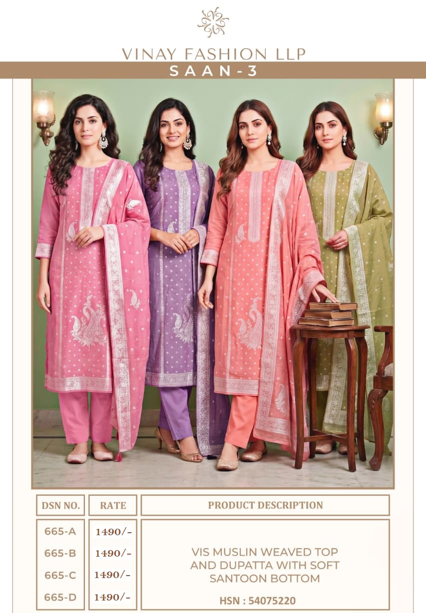 The Vinay Kuleesh Saan Vol 3 Viscose Salwar Kameez Collection combines comfort, elegance, and modern design, making it a strong addition to any ethnic wear collection. With premium viscose fabric and trendy patterns, this collection meets the expectations of customers looking for stylish and comfortable outfits.